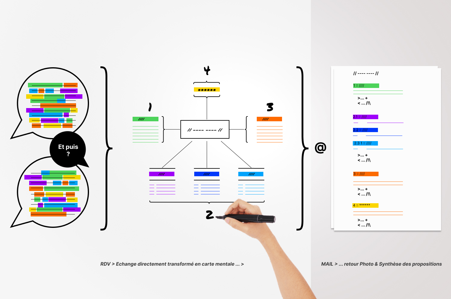 Pendant nos échanges, je crée en direct une carte mentale pour visualiser, structurer et analyser en temps réel les informations clefs d'un projet ou d’une situation, facilitant une réflexion approfondie et l'identification de solutions pertinentes.